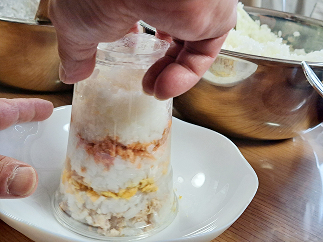 | 6月29日(土) | 夏バテ対策企画「おいしいおかずを作ろう!」 【内 容】 夏バテ対策メニューとして、寿司ケーキと手巻き寿司を作りました。材料は、キュウリ、カイワレ大根、卵、鮭フレーク、鳥そぼろ、マグロなどです。参加者全員手に付くご飯と闘いながら、何とか形にしました。見た目はどうある、味は抜群で、みなさん大喜びでした。 | 4名 |