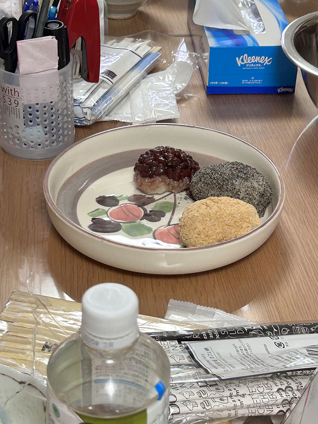 【内 容】 近隣の高校から頂いたモチ米を使って、おはぎ作りをしました。たくさん作ろうと炊飯器を2台使ったため、ブレーカーが何度も落ちましたが、無事炊き上がり、きな粉、すりごま、粒あんなどをまぶすのですが、もち米と具材をまるめる作業に皆さん苦戦していました。味はよかったのですが、来年は餅つき機を使いたいという声もありました。 |