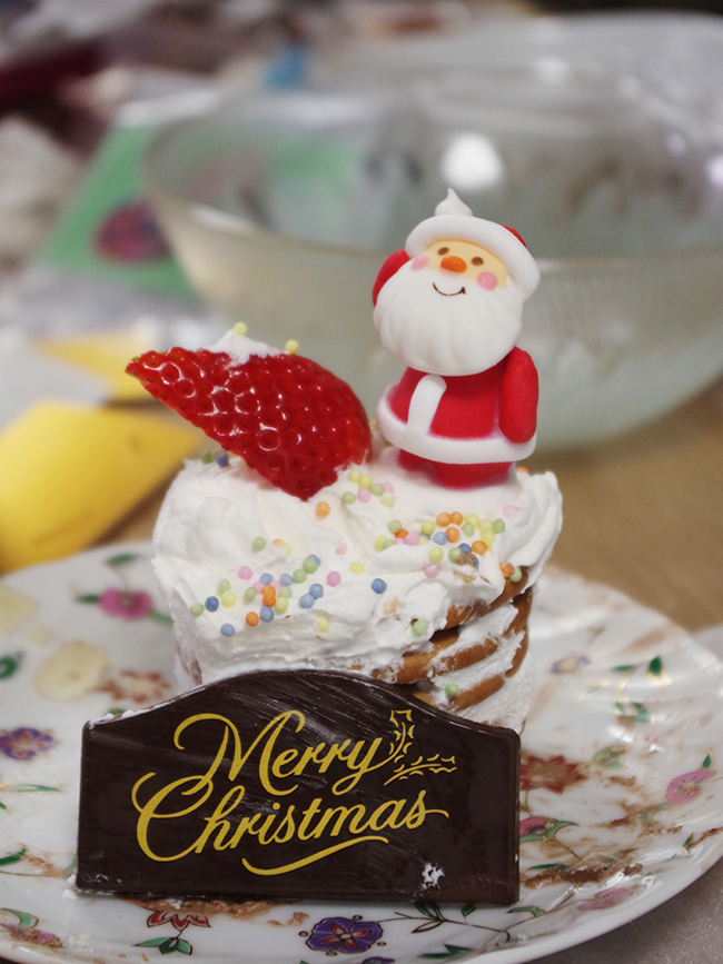 | 12月14日(土) | クリスマス企画 【内 容】 今話題の?「黒柳徹子ケーキ」を作りました。ビスケットを重ねながらホイップクリームを塗るという単純に見える作業でしたが、講師の見本のようにきれいに塗ることが出来ず、皆さん悪戦苦闘。全員形の違う結果となりましたが、冷蔵庫で冷やし実際に食べてみるとビスケットのサクサク感がたまらない逸品となり皆さん大満足でした。 | 6名 |